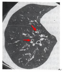 在横断面CT扫描上,环状软组织密度影代表扩张的支气管壁,圆形低密度空气影代表扩张的支气管内气体。与环邻接的圆形软组织密度影代表与扩张支气管伴行的肺动脉的横断面影像。