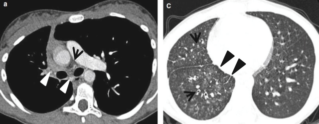 例如,以下是一例右肺动脉近端中断的10岁女孩。胸部增强CT扫描(主支气管水平,纵隔窗,左图)可见右肺动脉近端在心包内中断(黑箭头),且右支气管动脉及其分支增粗(白箭头)。肺窗(心室水平,右图)可见由扩张的支气管和伴随的支气管小动脉构成的印戒征,伴小叶中心毛玻璃密度结节(细箭头),右肺可见小叶间隔增厚(粗箭头)[7]。
