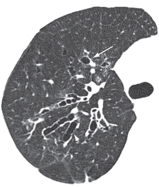 支气管扩张症:印戒征(长箭头)和双轨征(短箭头)[4]