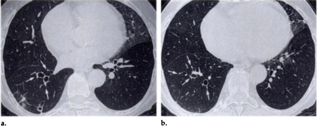 例如,以下是一位患有囊性纤维化的年轻患者的胸部CT,可见多发支气管扩张和印戒征[5]。