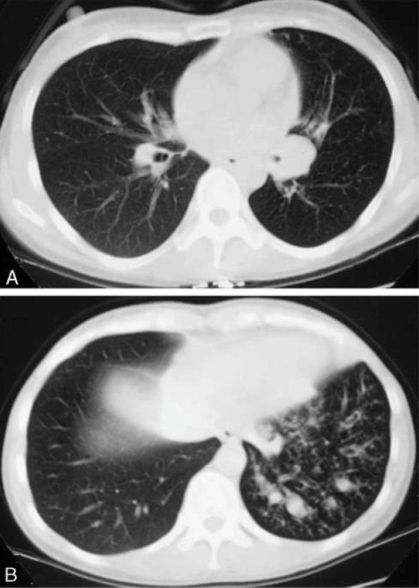 异物吸入并发支气管扩张症的38岁女性:胸部CT示印戒征和多发结节影[6]