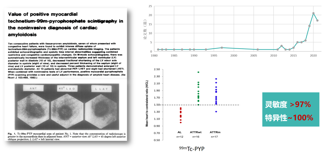 最早99mTc标记磷酸盐衍生物在核医学显像中主要用于进行骨显像及急性心肌梗死显像。早在20世纪70年代末80年代初,有病例报告及小型研究显示,CA(Cardiac amyloidosis, CA)患者的心脏对99mTc-PYP有独特的摄取模式,有助于心脏淀粉样变的诊断。但是,由于早期研究没有区分转甲状腺素蛋白心脏淀粉样变(transthyretin