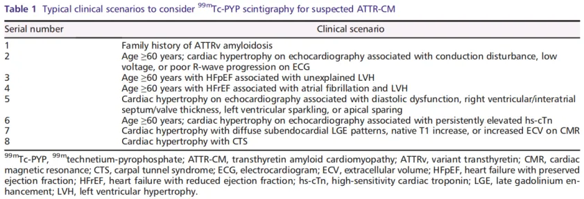 对于有ATTR-CA遗传家族史的患者或不明原因射血分数保留型心衰的老年患者(年龄≥60岁),强烈推荐患者进行99mTc-PYP显像。