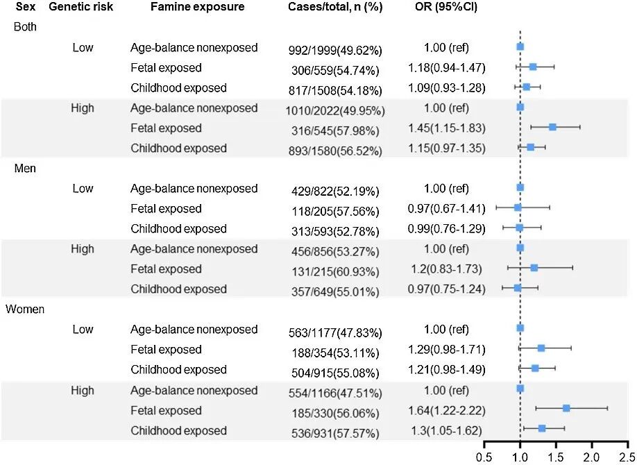 综上所述,这项研究提供了有力的证据,表明早期饥荒暴露与成年后MAFLD风险之间的正相关关系在具有高遗传易感性的个体中更为显著,尤其是在女性中。这一发现强调了在生命早期提供充足营养的重要性,尤其是在那些遗传风险较高的个体中。