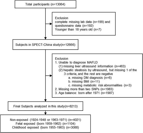 研究纳入了8213名来自“中国华东地区代谢性疾病患病率及危险因素调查(SPECT-China)”研究参与者的数据。研究人员根据参与者的出生年份定义了饥荒暴露亚组,并构建了一个基于与MAFLD相关的单核苷酸多态性(SNPs)的遗传风险评分(GRS)。通过逻辑回归模型,研究团队分析了饥荒暴露和GRS与MAFLD之间的关联。
